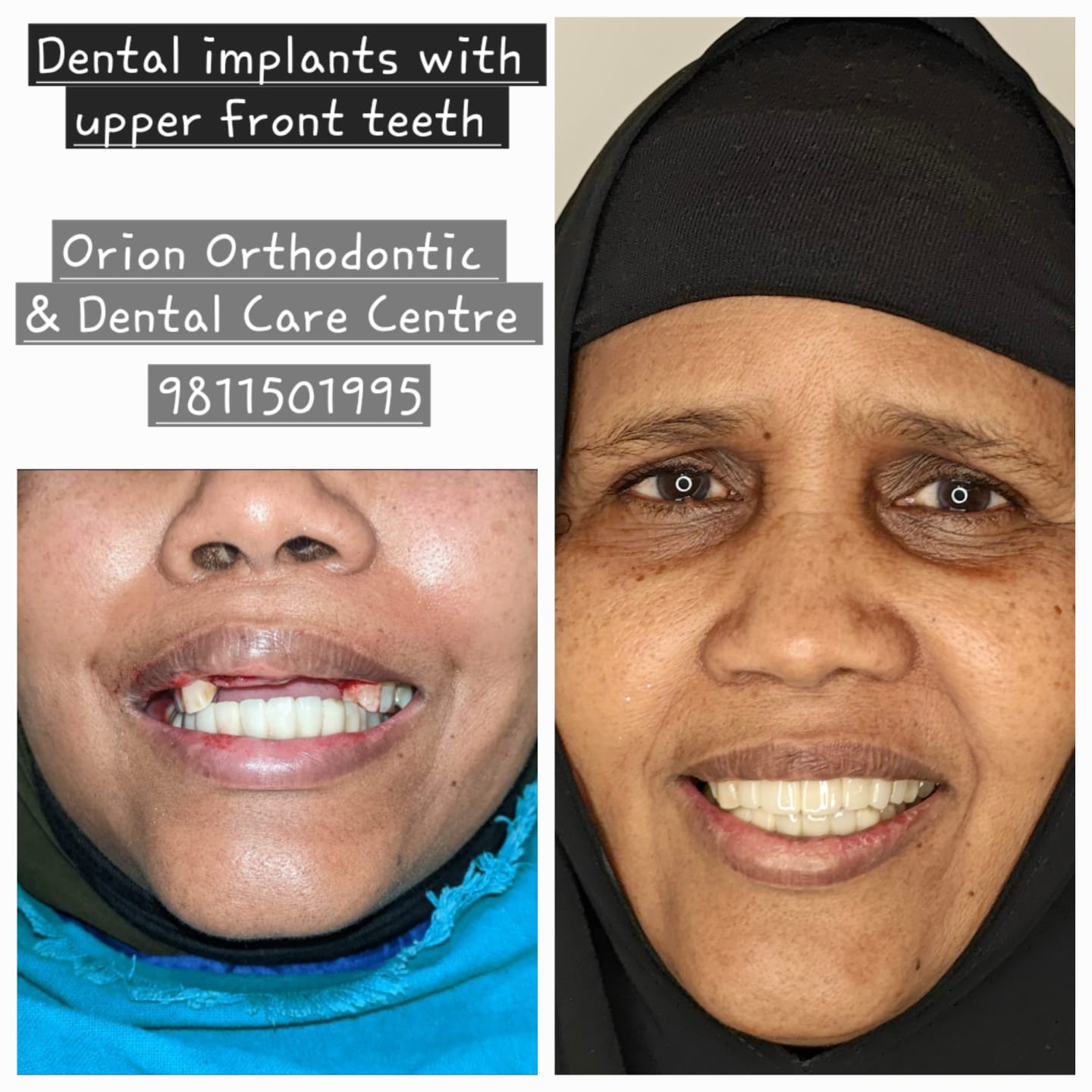 Multiple Teeth Dental Implants in Delhi – Secure & Aesthetic Tooth Replacement by Dr. Anupam Sinha Missing more than one tooth? At Orion Orthodontic & Dental Care Centre, we offer multiple teeth dental implants in Delhi as a durable, functional, and natural-looking solution for patients who have lost several adjacent teeth. Led by Dr. Anupam Sinha, a leading implantologist with 20+ years of experience, we specialize in placing implant-supported bridges that restore your smile without compromising surrounding healthy teeth. Unlike traditional dental bridges that rely on grinding down neighboring teeth for support, dental implant bridges are anchored by titanium implants surgically placed in the jawbone. This not only preserves adjacent teeth but also maintains jawbone health and offers superior biting strength and aesthetics. Why Choose Dental Implants for Multiple Missing Teeth? Avoids damage to adjacent natural teeth Prevents bone loss and gum recession Fixed solution—no slipping or clicking Restores normal chewing and speech Long-term value and easy maintenance Treatment Options Two Implants + Three-Unit Bridge – Ideal when 3 teeth are missing in a row Multiple Implants for Segmental Tooth Loss – Customized according to missing tooth pattern Zirconia or Porcelain Bridge Options – For a natural and aesthetic finish Implant Bridge Procedure Consultation and digital 3D scans Implant placement surgery Healing phase (3–4 months for osseointegration) Temporary bridge (if needed) Final custom bridge placement Cost of Multiple Teeth Implants in Delhi Pricing varies based on the number of implants, span of the bridge, and material chosen: 2 implants with 3-unit bridge: ₹55,000 – ₹90,000 4 implants with 5 or 6-unit bridge: ₹1,10,000 – ₹1,80,000 We offer EMI options, transparent pricing, and free consultations for treatment planning. Recovery & Results Recovery from implant bridge surgery is typically quick. Mild swelling or discomfort may occur for a few days. Once healed, patients experience improved chewing ability, better facial aesthetics, and restored confidence. Frequently Asked Questions (FAQs) 1. What’s the difference between an implant-supported bridge and a traditional bridge? Traditional bridges use adjacent teeth as anchors. Implant-supported bridges use titanium implants, preserving natural teeth and bone. 2. How many implants are needed for a bridge? Usually, two implants can support a 3-unit bridge. For larger spans, 3–4 implants may be required. 3. Is the procedure painful? No, the procedure is done under local anesthesia, and conscious sedation is available if needed. 4. How long do implant bridges last? With proper care, they can last 15–25 years or more. 5. Can I eat normally with a dental implant bridge? Yes, they function just like natural teeth. You can eat comfortably and speak clearly. 6. Do you offer conscious sedation? Yes. Conscious sedation is administered by our senior anesthetist (35+ years’ experience) for ₹15,000 per jaw, ensuring a stress-free experience. Ready to Restore Multiple Missing Teeth? Book a consultation with Dr. Anupam Sinha at Orion Orthodontic & Dental Care Centre today. Call/WhatsApp us at 9811501995 to explore your options for multiple teeth dental implants in Delhi. What Our Patients Say “I had three missing teeth in a row. Dr. Sinha’s implant bridge restored my bite perfectly. I feel like I got my real teeth back!” – Mr. A. Mehra, Delhi “Professional care and a seamless procedure. My confidence is back thanks to my new implant bridge.” – Mrs. Sunita T., CR Park “Highly recommend Orion Dental for implant work. Everything was clearly explained and flawlessly executed.” – Mr. Faisal A., Lajpat Nagar Smile Gallery – Before & After See our real-life success stories of dental implant bridges in Delhi. View Gallery Post-Procedure Care Tips Stick to soft foods for the first few days Avoid chewing on the implant site during healing Full Mouth Dental Implants Single Tooth Implants Zirconia Implants Bone Grafting & Sinus Lift Dental Implants for NRI Patients